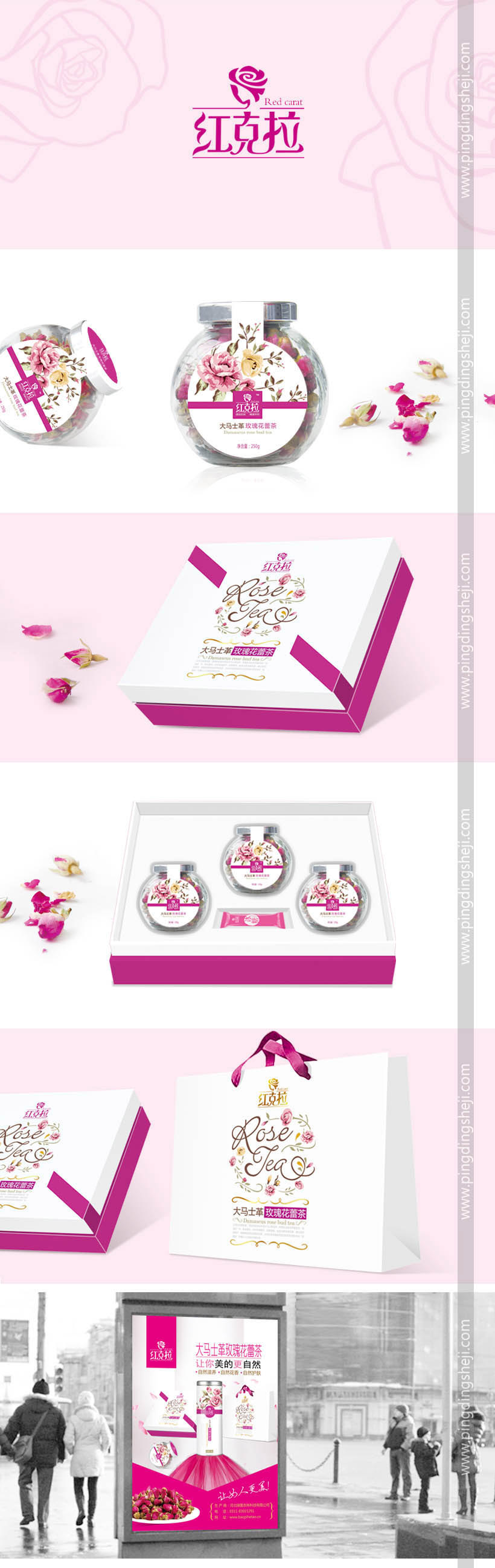 好产地+好玫瑰+好包装=女人好喜欢 红克拉品牌命名:红代表红色玫瑰花的颜色,克拉会让人联想到钻石,如同钻石般的珍贵。 商标的设计通过女性优美侧脸与玫瑰花的结合、欧式图案与红克拉字体的结合,更好的符 合产品的定位,面对中高端女性的茶饮产品。 包装设计以体现玫瑰美与女性爱美习惯结合起来,使包装更有档次。 工作内容:商标设计,品牌故事、包装设计,品牌化包装,产品卖点,产品广告语,海报设计 |